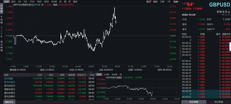 同时,英镑兑美元短线一度跳升20余点至1.1299,现报1.1264,日内涨幅为0.39%。