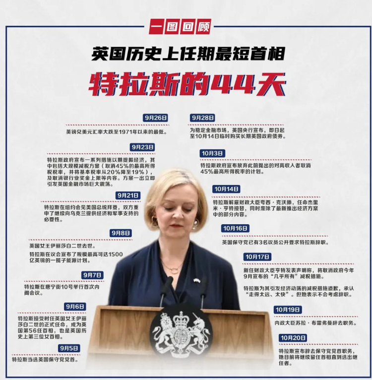 特拉斯上任仅45天,是英国所有首相中任期最短的。在职时间第二短的首相是乔治·坎宁,他在任上去世时任职了119天。