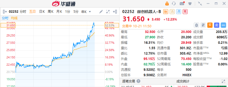 10月21日讯,微创机器人-B(02252)早盘再涨超12%,较本月14日低位至今累涨逾80%。截至发稿,涨12.23%,报31.65港元,成交额6090万港元。