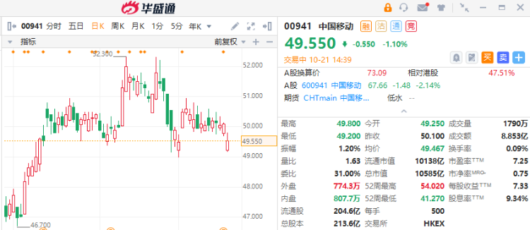 10月21日讯,中移动(00941.HK)今日股价偏淡,现跌1.1%报49.55港元。公司昨日(20日)收市后公布截至今年9月底止首三季业绩,纯利985.32亿元人民币按年升13%,略低于市场预测。