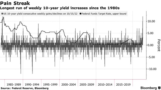 美国国债已进入38年来持续时间最长的低迷期,因为美联储政策制定者表示他们决心继续加息,直到他们确定通胀得到控制。基准10年期美债收益率本周至今上涨21个基点,周五来到4.23%,连续12周上涨,持续时间堪比1984年美联储主席沃尔克执行一系列快速加息时期。 目前掉期交易商预计美联储的政策利率将在2023年上半年达到5%,为美联储的政策利率定价的最高峰值。“这是一个里程碑”,美国前财政部长萨默斯说。市场暗示的终端利率“更有可能上升更多”。