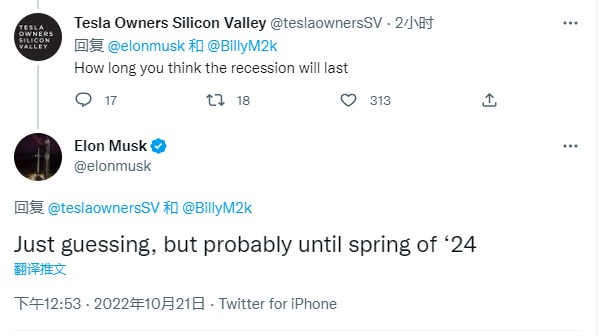 4、马斯克预言:全球经济衰退可能持续到2024年春天