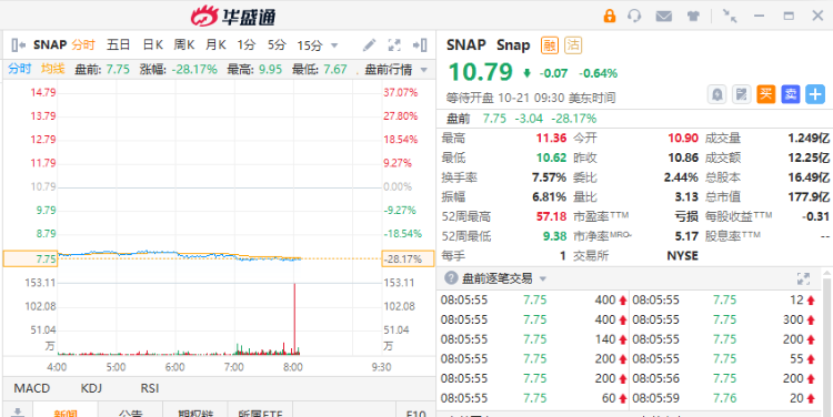 截止北京时间20:26,Snap盘前大跌28%,报7.75美元。财报显示,Snap调整后每股收益为8美分,高于市场预期的小幅亏损或盈亏平衡。报告期内收入为11.3亿美元,低于市场预期的11.4亿美元,收入同比增速仅为5.7%,这是自公司2017年上市以来首次降至个位数,同时低于该公司自己在8月份预测的8%的增速。