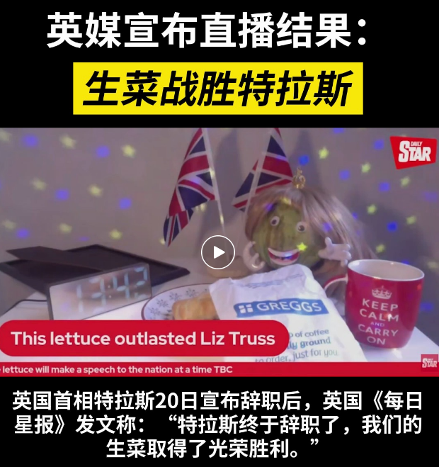 内外交困之下,有英国媒体甚至掏出了一颗绿油油的生菜,对着镜头直播,准备对比是菜先坏掉,还是特拉斯先下台。
