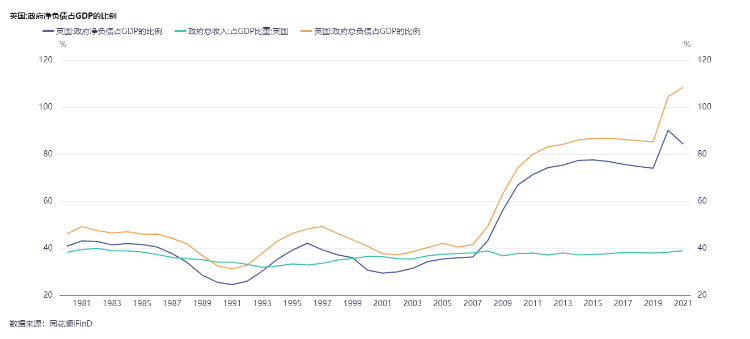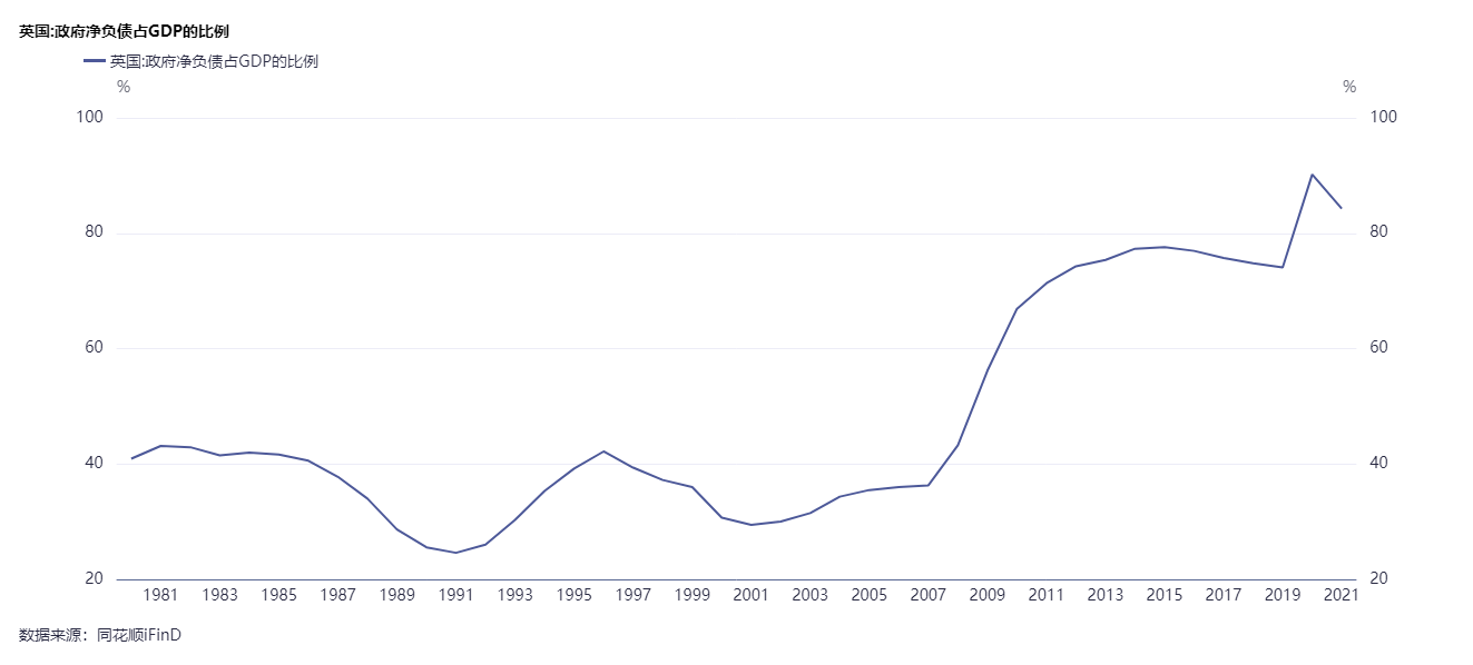 但英国政府本就债台高筑,政府净负债占GDP比重已达GDP的80%左右;如果算上金融资产(包括很久之后才能变现的票据等),总负债已经超过了GDP(如下图)。这样算下来,内阁哪来的钱兜底养老金?