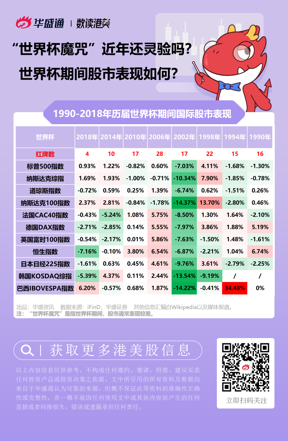 对既是足球迷又是投资者来说,这次世界杯期间股市会否出现“世界杯魔咒”(即世界杯期间股市通常表现较弱)值得留意。摩根士丹利研究90年代前的数据,发现一个有意思的现象:世界杯期间红牌数量越多,股市走势就越牛。那么,最近几届世界杯是否依旧如此?一起来看看吧。