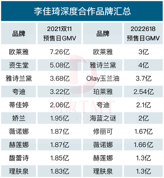 数据显示,去年双11,在李佳琦直播间欧莱雅GMV高达到7.26亿,资生堂GMV5亿、雅诗兰黛和夸迪破了3亿,蒂佳婷、娇兰、薇诺娜等6个品牌破亿。