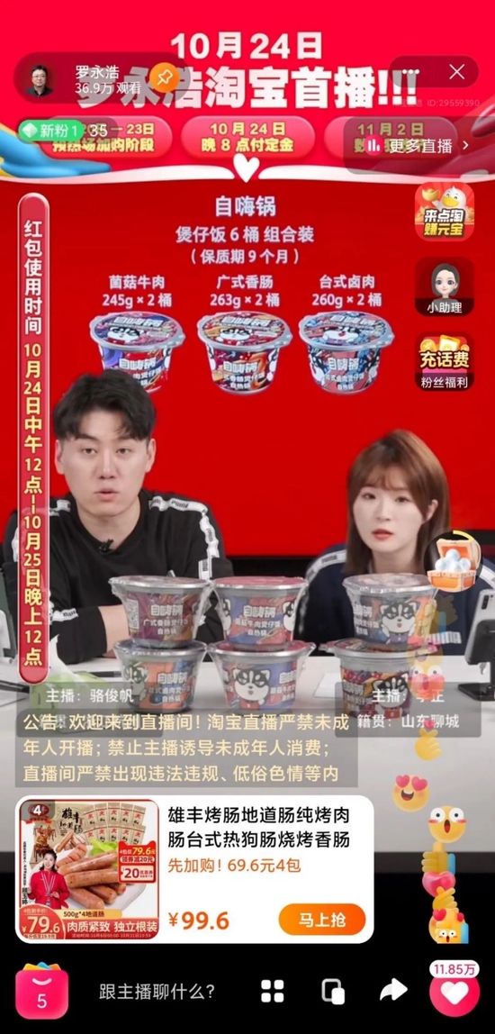 但他们这场直播的重点并不是卖东西,而是告诉所有直播间用户:10月24日,也就是今年双11第一天,罗永浩要来淘宝直播。