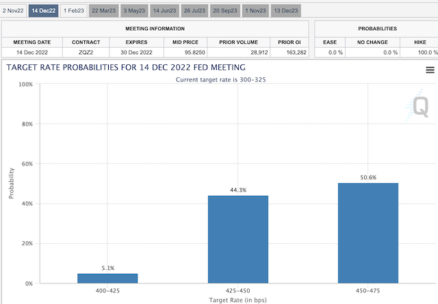 市场迅速调整预期,截至第一财经记者发稿,据芝商所利率观察工具(FedWatch Tool ),美联储12月将联邦基金利率上调至4.50%~4.75%区间的概率—即未来两次议息会议均加息75个基点—由前一日的75.4%大幅下降至50.6%;美联储年底加息至4.25%~4.50%区间的概率—即未来两次会议中的某次仅加息50个基点—由前一天的24.2%升至44.3%。