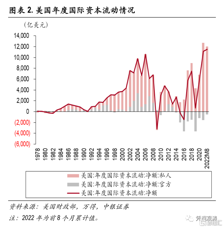 今年前8个月,海外投资者(包括私人和官方)在美国累计净买入证券资产11501亿美元,同比增长了44%。值得指出的是,今年以来的累计净流入额已超过去年全年的总流入额11114亿美元,创下自1978年有数据以来的新高(见图表2),表明国际资本正在加速回流美国,全球“美元荒”加剧。