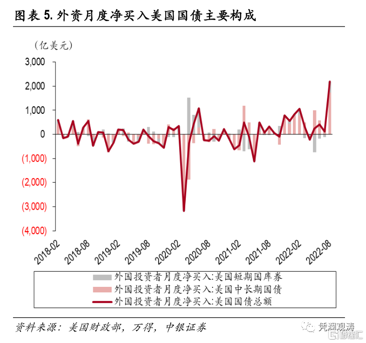 从外资持有美债的流量数据来看,今年8月份,外资净买入美债2192亿美元,单月增幅为1978年以来新高,是2008年10月历史次高1782亿美元的1.23倍(见图表4)。按交易品种来看,当月外资净买入中长期美债1742亿,占净买入额的79.5%;净增持短期国库券450亿美元,占比为20.5%,是今年3月以来再度恢复净增持,单月增持规模为2020年7月以来的最高(见图表5)。