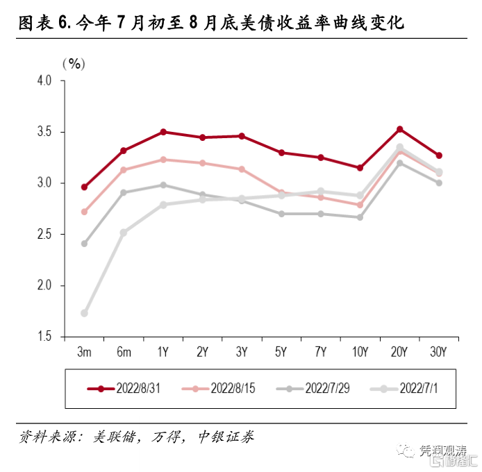这主要由于随着美联储紧缩预期再度加强,美债收益率上行增加了美债对于国际资本的吸引力。特别是8月26日,美联储主席鲍威尔在杰克逊霍尔年会上发表简短直接的鹰派讲话,彻底打消了市场押注美联储转向的乐观预期,导致8月中下旬以来,美债长短端利差倒挂程度加深(见图表6)。同时,市场对于美国和世界经济衰退预期增强。8月,美债10年期和2年期平均利差为-35BP,负值较上月增加21BP,最低为8月9日的-48BP,接近-50BP的历史低值;美债10年期和3个月利差由7月均值60BP快速收敛至18BP,最低为8月1日的4BP,离倒挂仅一步之遥(见图表7)。这也驱动全球避险资金逃向美债此类安全资产。
