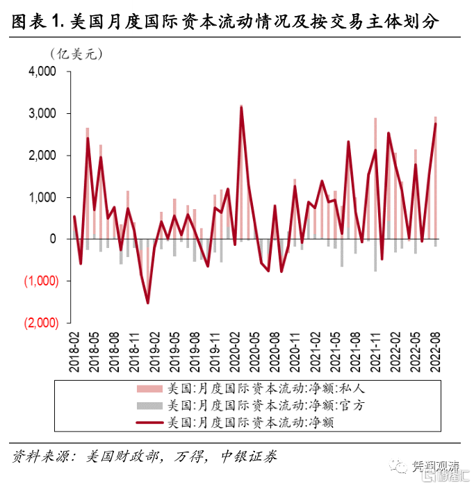 综合8月美国的国际资本流动数据可知,外资正在加速买入美元资产,其中:私人投资者连续多月增持美国资产,且步伐进一步加快,单月美债净买入额创下历史新高;官方投资者虽然恢复减持,但步伐较前几年有所放缓,全球美元荒加剧。美债作为安全、流动的全球避险资产,往往是全球投资者在全球金融动荡时的首选。如今,伴随着美联储连续大码加息,美债利率快速飙升,利差和避险因素共同驱动国际资本回流美国,带动美元指数创下近二十年以来的新高。