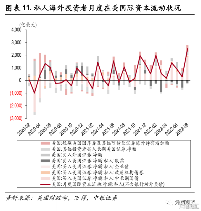 剔除银行对外负债变动后,私人海外投资者当月在美增持证券资产2500亿美元,为连续第11个月净增,增持规模是前7个月平均值的3倍以上,显示资金整体回流美国[1]。其中,主要正贡献项是美国中长期国债和短期国库券,两者分别净增1819、486亿美元,分别贡献了增持规模的73%、19%。其次,美国投资者卖出外国债券238亿美元,贡献了10%。