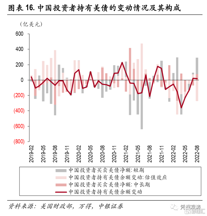 英国投资者则略有不同。8月末,英国投资者持有美债余额6447亿美元,环比增加101亿美元。其中净买入中长期美债998亿美元,净卖出短期国库券717亿美元,总计净买入美国国债281亿美元,负估值效应为180亿美元。今年前8个月,英国持有美债余额累计减少27亿美元,净买入中长期国债3367亿美元,占到外资全部净买入额的60%,净卖出短期国库券2783亿美元,累计净买入美债584亿美元,负估值效应累计611亿美元(见图表15)。这说明英国投资者总体采取了“锁长卖短”的策略,是中长期美债的主要买入方。