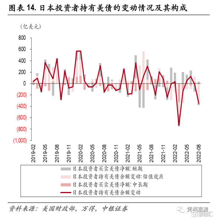 据此计算,8月日本投资者净卖出短期国库券36亿美元,总体净卖出美债2亿美元,负估值效应343亿美元,贡献了美债持有余额下降的99%。今年前8个月,日资持有美债余额较去年底累计下降1043亿美元,其中日资减持中长期美债476亿、增持短期美债650亿美元,总计净增持美债174亿美元,负估值效应1217亿美元(见图表14)。