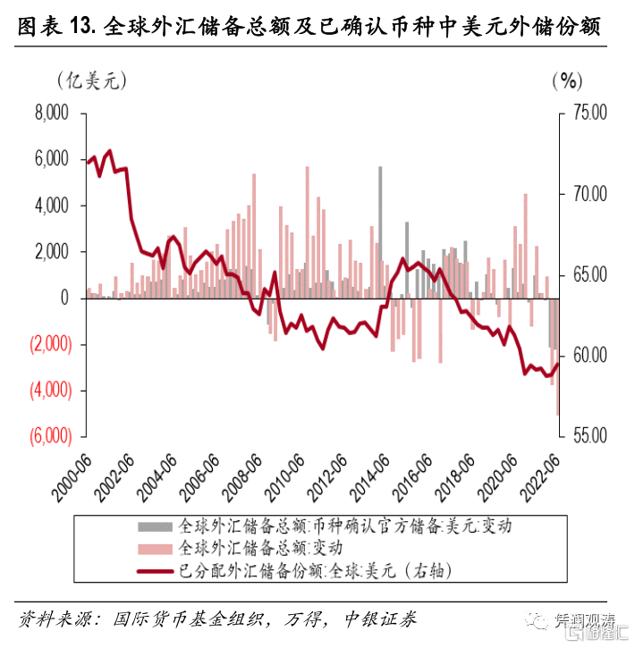 总体来看,官方投资者仍在净减持美国证券资产,今年上半年全球已确认币种的外汇储备中美元余额也出现下降。但由于今年以来美元大幅升值,主要非美货币兑美元普遍贬值,导致全球外汇储备总额折美元大幅减少,美元外储份额却不降反增。国际货币基金组织(IMF)公布的全球外汇储备数据(COFER)显示,截止今年6月末,全球外汇储备余额为120368亿美元,较上年底减少了8838亿美元,为历史同期最大降幅;全球披露币种构成的外储余额111749亿美元,减少了8749亿美元;已披露币种构成的外汇储备中美元储备余额为66524亿美元,减少了4336亿美元,为自2000年以来的最大降幅,但由于分母降幅更大,美元储备份额由上年底的58.81%升至59.53%,增加了0.72个百分点(见图表13)。