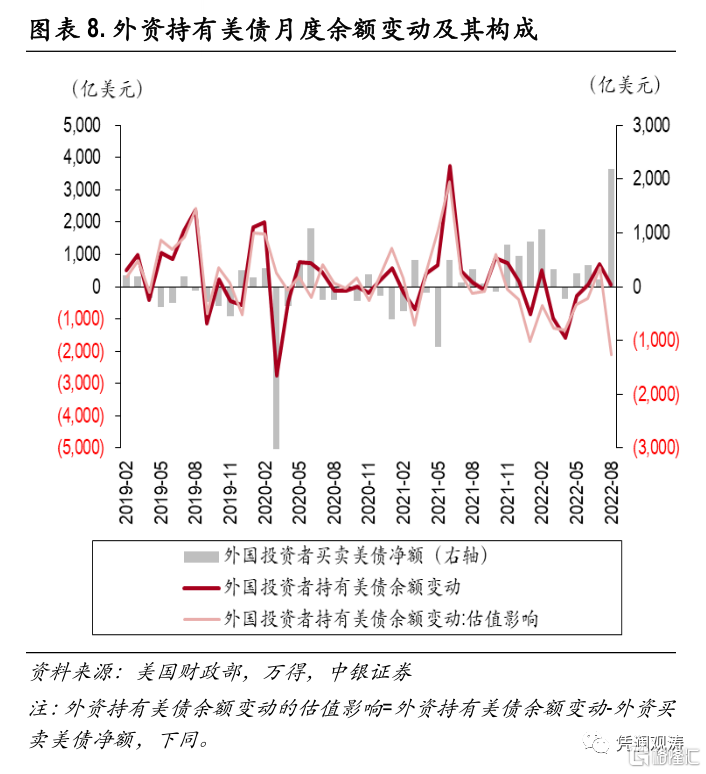 三、8月外资持有美债余额小幅上升,但今年以来余额不升反降,主要受到负估值效应影响