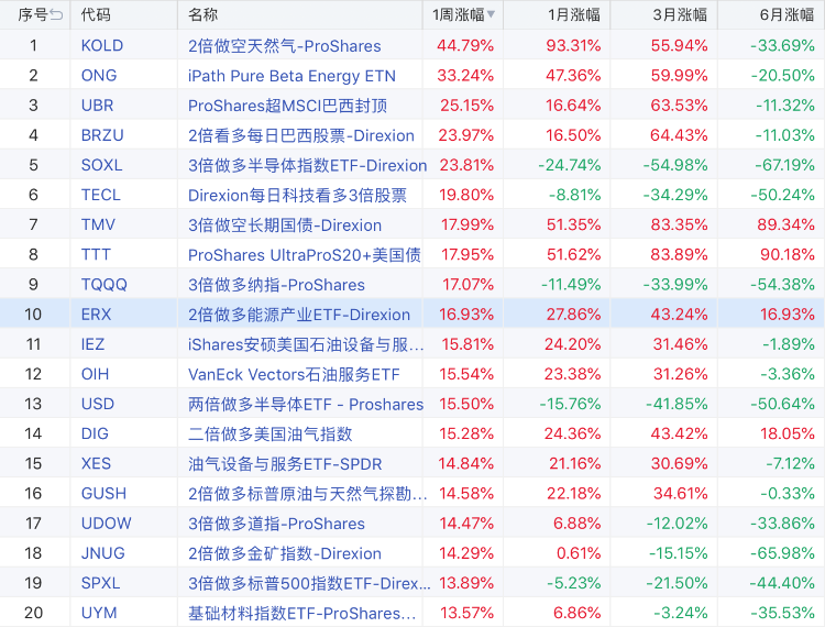 从ETF涨幅榜来看,2倍做空天然气ETF $KOLD 登顶全周涨幅榜冠军,累计上涨44.79%。天然气全周表现弱势,欧洲天然气周五跌超10%回吐周内周四涨幅,全周跌超20%;美国天然气创七个月新低,连续9周下跌。