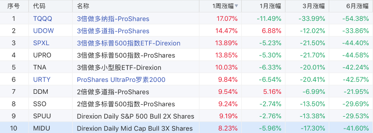 本周指数多头大赚!3倍做多纳指ETF $TQQQ 全周大涨超17%,3倍做多道指ETF $UDOW 累涨14.47%,3倍做多标普500指数 $SPXL 涨13.89%。反向ETF中,3倍做空纳指ETF $SQQQ 全周下跌16%。