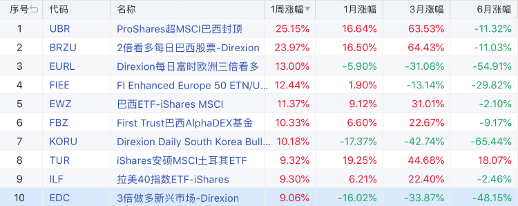 区域ETF方面,新兴市场ETF表现亮眼,2倍做多巴西ETF $UBR 全周上涨25.15%,巴西IBOVESPA股指连涨五日。此前华尔街研报指,在今年这轮美元强势升值的表现下,巴西等新兴市场损失竟比发达国家少得多,巴西雷亚尔等货币表现出强大的韧性。大摩称,强劲的外部账户和颇具吸引力的利差交易是该地区货币相对强势的主要推动力。