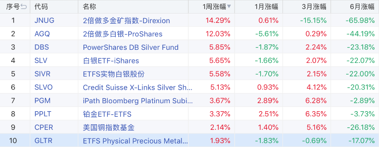 商品ETF方面,金价全周收涨,做多ETF多数领涨。2倍做多金矿指数ETF $JNUG 周涨超14%,位居涨幅榜第一位;2倍做多白银ETF $AGQ 周涨12.03%,位居涨幅榜第二位。