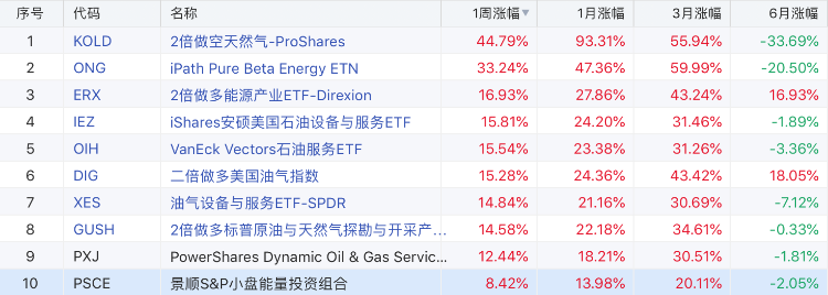 能源ETF方面,周内欧美天然气双双重挫,2倍做空天然气ETF $KOLD 周涨近45%,该ETF追踪彭博商品指数系列之一的Bloomberg Natural Gas Subindex。2倍做多天然气ETF $BOIL 全周则累计下跌33.37%。