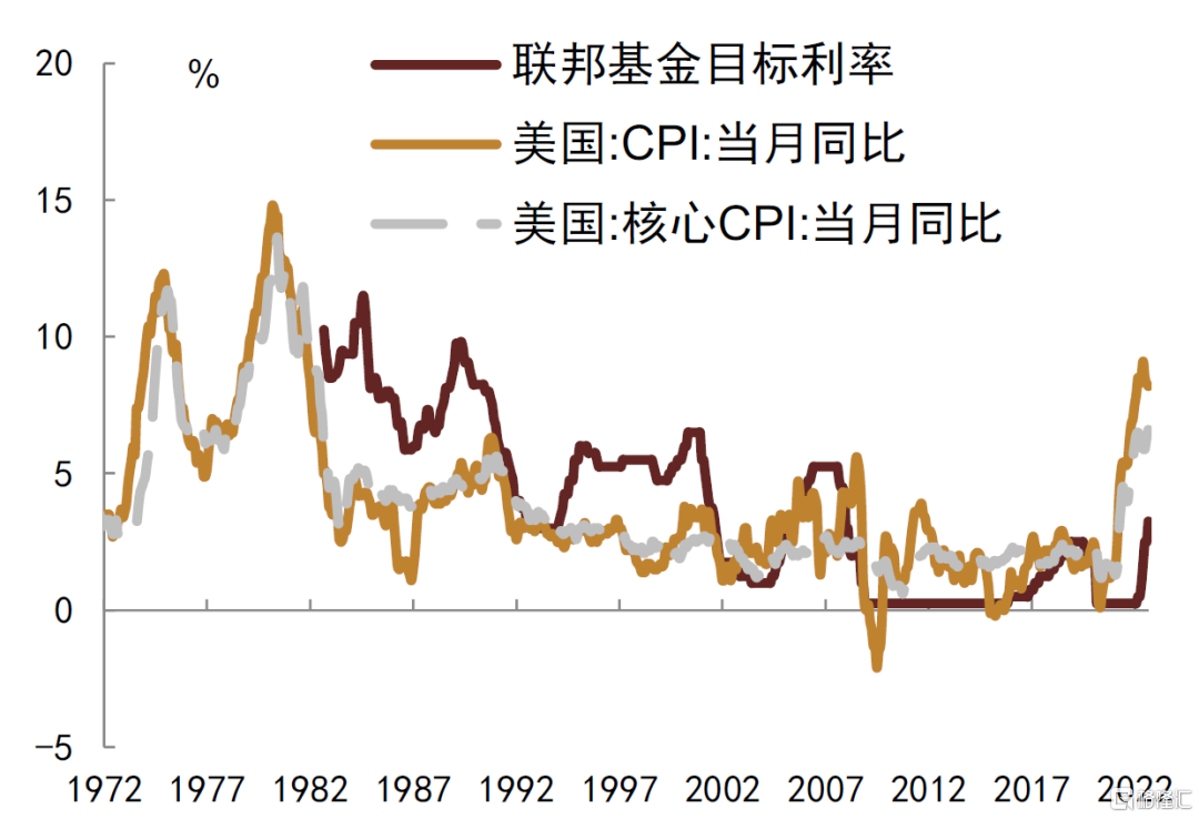 其实本轮美国通胀与70年代两轮滞胀其实存在着一定相似之处,都伴随着全球大宗商品价格的快速上涨期、劳动力市场偏紧工资-通胀螺旋有助推效果,以及前期宽松的货币政策所留下的货币超发问题(图表2)。近月来国际商品价格已有较为明显的回落,以美联储为代表的西方发达经济体央行也均处于较为激进的加息通道中,但通胀水平并未如期回落,我们认为过于宽松的流动性对通胀持续处于高位起到了一定推波助澜的作用。