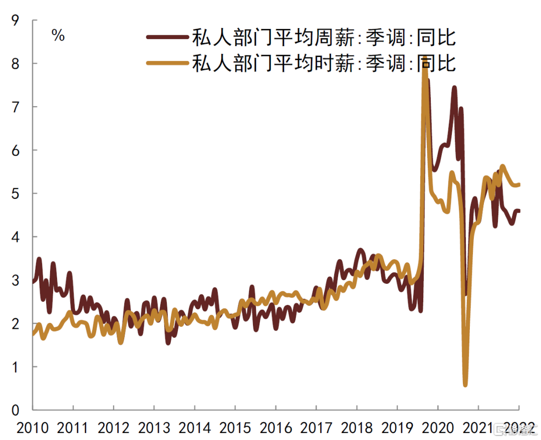 美国就业市场仍然偏紧,工资增速偏高不利于控制高通胀。本轮美国高通胀是多种原因造成的,不但有需求因素和货币因素,还有供给因素,尤其是劳动力市场。新冠疫情对劳动力市场带来结构性影响,使得整体劳动参与率下降,当前劳动参与仍明显低于疫情前水平,同时非劳动力中想工作人口占比也处于低位(图表18)。劳动供给不足使得职位空缺持续处于高位,8月美国非农职位空缺率仍达6.2%,远高于疫情前2019年12月的4.3%,职位空缺较多使得就业人员议价能力较高,在高通胀背景下,这很容易带来工资上涨,9月美国非农私人部门时薪同比增速达5.2%(图表19),8月美国个人工资和薪酬总收入同比增速仍达8.6%,而工资上涨又使得通胀持续体现韧性,尤其是体现为服务价格加快上涨。随着货币持续收紧,近期劳动力市场边际有所走弱,但是整体偏紧局面依然延续,这对居民收入乃至消费仍有支撑,最终体现为通胀还有韧性。后续仍然需要更多紧缩来抑制需求,需要职位空缺明显下降,甚至是失业率明显抬升,才能降低工资增速,从根本上控制通胀和通胀预期。