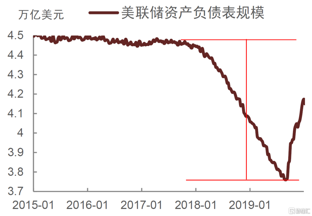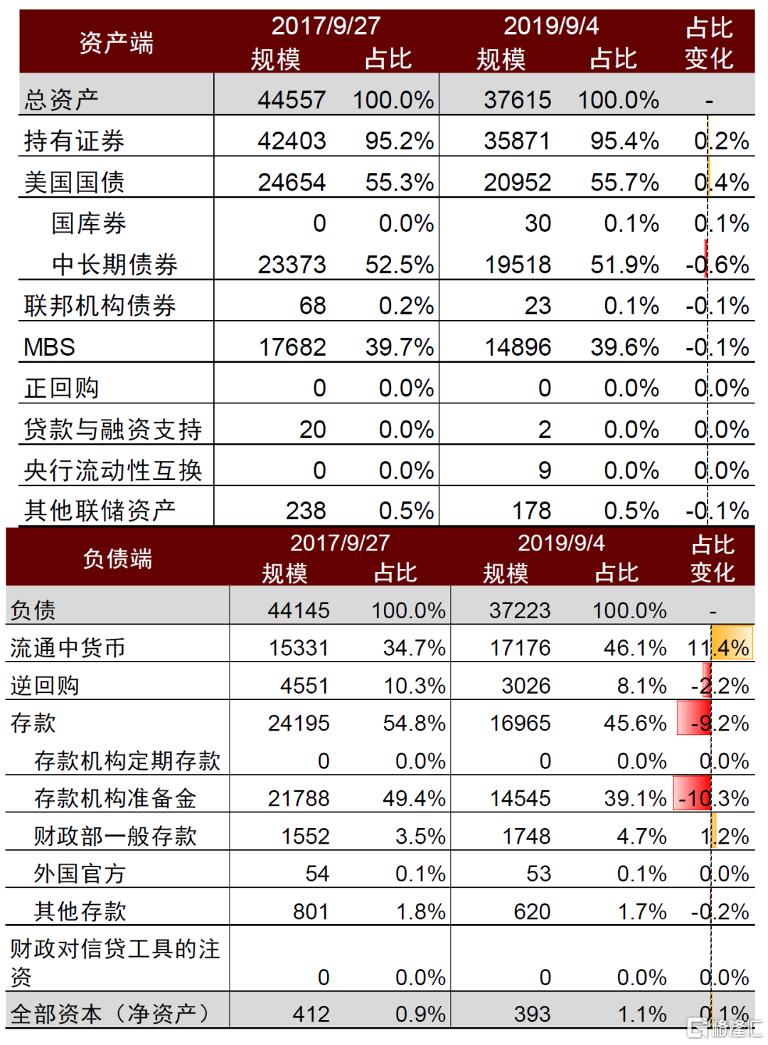图表8:2017-2019年缩表前后美联储资产负债表变化(规模,亿美元)
