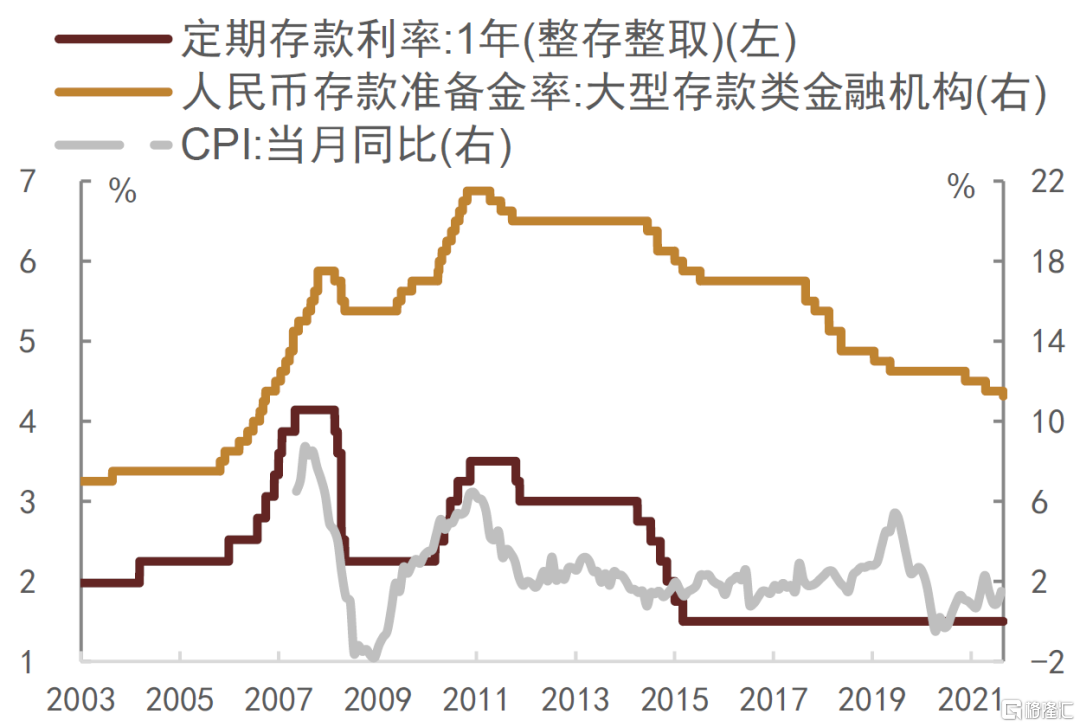 2010年中国通胀压力快速上升,2010年11月CPI同比增速突破5%。为应对通胀压力,人民银行一方面持续上调基准利率,将一年期定存利率从2.25%提高至2011年11月的3.5%(图表14),另一方面不断上调法定存款准备金率,2011年8月还将保证金存款纳入存款准备金缴存范围,明显收紧流动性。随着货币政策持续收缩,国内融资增长明显放缓,M2季度增量从2010年的2-3万亿元降至2011年中的1-2万亿元左右,其中2011年三季度M2增量仅为0.66万亿元,创2005年以来新低。流动性的大幅收紧下,以PMI为代表的经济动能开始放缓,GDP增速也从2011年三季度的19.4%降至2012年末的9.1%,通胀水平也从2011年8月的6.2%降至2012年10月1.7%的低位(图表15)。