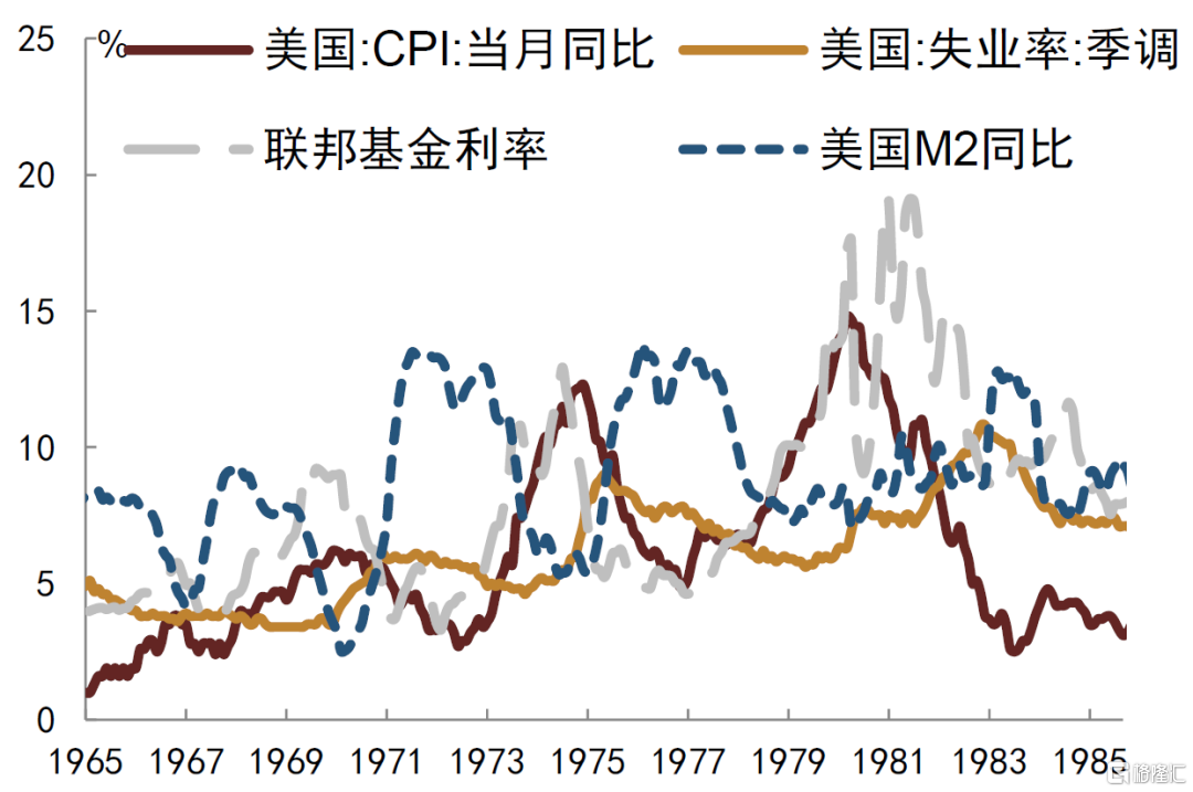 回顾上世纪70年代美联储治理通胀的历程我们可以看到,上世纪70年代经历了两轮明显的滞胀。第一轮滞胀期间时任美联储主席伯恩斯虽然也采取了紧缩政策来对抗通胀,但在他的两任任期内,美联储货币政策独立性并不算高,货币政策时常受到政治周期影响,主要体现在通胀已经展现出顽固性和高企特征的时候仍然过于重视失业率和经济衰退带来的负面影响(图表3)。并且伯恩斯任内虽然在早期就将货币供应量纳入美联储政策目标体系,但美联储实际货币政策制定与操作中仍主要锚定利率,货币政策紧缩也主要依靠利率手段。因而我们可以看到,在1971-1978年间,第一轮滞胀虽然得到了暂时性的抑制,但M2同比在两次短暂回落后又重新快速增长。伯恩斯任期内的利率调整幅度对于双位数增长的CPI水平来说也相对克制,且美联储在加息到一定高度、通胀拐点出现、失业率出现回升后就马上降息。这种较为保守的货币紧缩为第二轮滞胀的卷土重来埋下了隐患,1978年开始,美国CPI重新进入高速上涨通道。