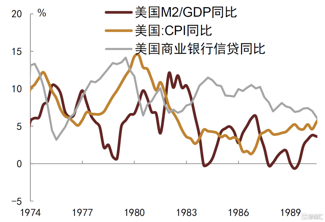 货币政策目标转变带来的实际效果是为美国政策利率的“无上限”上升提供了便利条件。上世纪80年代期间美国政策利率在资金供给快速收缩的带动下最高点达到20%左右,对应到货币供应与实体信贷的表现上,1979-1980年间美国M1货币供应量出现较为明显的下行,随后政策利率和实际利率开始快速上升,由此才对过热的总需求产生了一定压制效果(图表4)。M1收紧带来货币紧缩的同时,实体信贷也有较为明显的收紧,1980年一季度到三季度美国商业银行信贷同比处于快速下行通道中(图表5),美国M2/GDP占比在1980-1982年间也持续下行。在货币与信贷开始出现收紧一段时间后,CPI同比才逐步从高位回落。