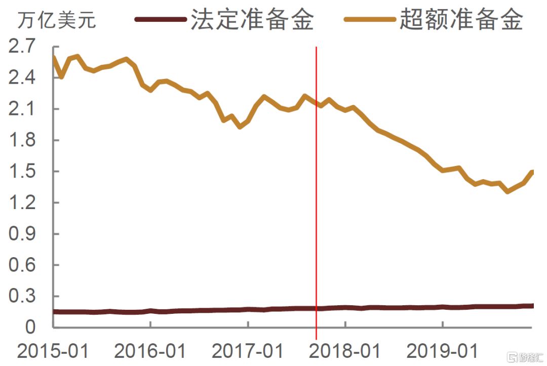 2017年10月-2019年9月缩表期间,美联储计划最初三个月缩表规模为每个月60亿美元国债和每月40亿美元 MBS,之后每三个月将国债和MBS的缩减上限分别提高60亿美元和40亿美元,至2018年10月每月缩表规模达到300亿美元国债和200亿美元MBS,合计占缩表前美联储所持国债和MBS总规模的1.18%,此后维持不变。对比缩表前后,美联储资产负债表规模从4.46万亿美元降至3.76万亿美元,缩表总规模为6942亿美元,占缩表前资产负债表总规模的15.6%(图表7)。从资产端来看,缩表前后美联储所持资产均以美国中长期国债和MBS为主,二者仅规模同时下降,占总资产比重基本未发生变化(图表8,上)。负债端变化则相对明显,主要体现在存款机构准备金和逆回购的下降,以及流通中货币的增加(图表8,下)。与缩表前相比,2019年9月缩表结束时,存款机构准备金由2.18万亿美元下降33.2%至1.45万亿美元。其中,法定存款准备金从缩表前2017年9月的1842亿美元小幅增加155亿美元至1997亿美元,主要在于超额存款准备金从2.17万亿美元下降约8686亿美元至1.31万亿美元(图表9),表明美联储缩表主要是减少了银行系统的超额准备金,银行间流动性收紧。此外,美联储负债端逆回购余额从4551亿美元下降33.5%至3026亿美元。在此过程中,隔夜逆回购规模逐步下降(图表10),表明货币市场流动性也逐步收紧。