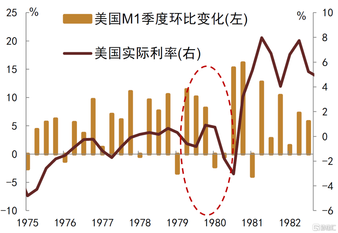 1979年8月沃尔克接任美联储主席,并开始了针对高通胀的治理。沃尔克采取的其中一条非常重要的措施即为将美联储政策目标从利率完全转向货币供应。彼时的美国面临的情况是,在通胀长期高企而利率上行远不及通胀时,美国实际利率已降为负(图表4)。一方面,实际利率才是真正影响总需求及实体经济融资需求的变量,另一方面,实际利率为负也直接削弱了政策利率对于美联储紧缩态度表达的力度,美联储货币政策对于通胀预期的引导作用出现降低。1979年沃尔克上任后,开始着手于控制货币数量(锚定M1)。具体包括:1980年《货币控制法案》要求所有存款机构缴纳准备金,扩大了准备金的缴纳范围。同时美联储的借入准备金机制也有所变化,借入准备金目标由每年FOMC会议设定的M1增速目标推算得出。且1980年一季度新的“特别信贷限制计划”出台,货币供给的增长得到了进一步压缩。