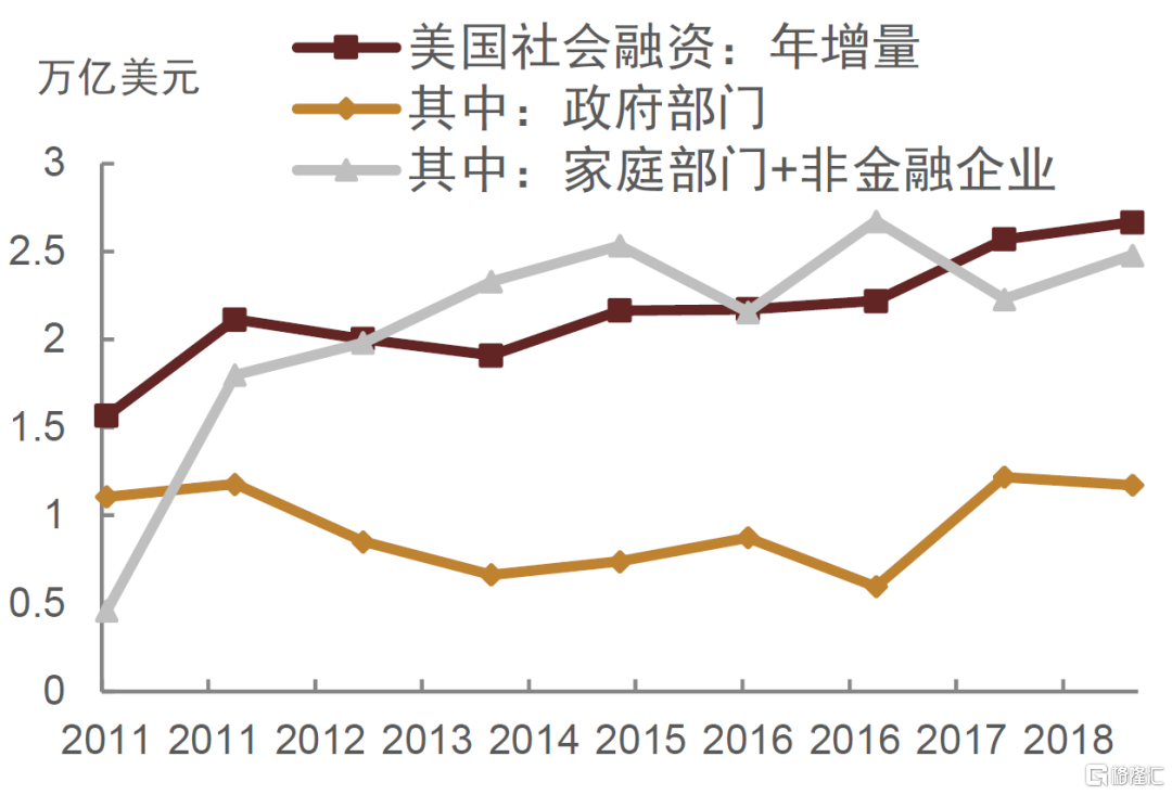 图表12:美国整体社融增量并未减弱,主因政府融资较强,家庭和企业有所回落