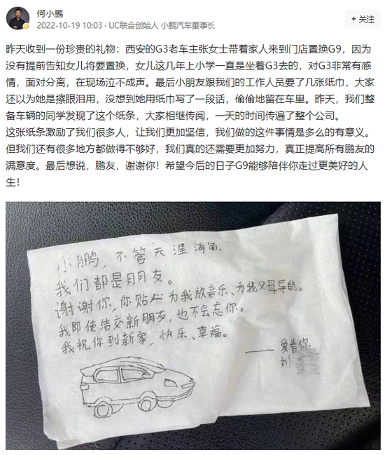 10月19日,何小鹏在个人社交账号分享了一张纸巾留言,被配文称,一位小鹏G3老车主老门店置换新车G9,车主女儿“对G3非常有感情,面对分离,在现场泣不成声”。而纸巾上,则是由小女儿手写的对于小鹏G3的感谢话语。