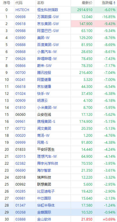 成分股中,万国数据跌超16%,京东集团-SW、阿里巴巴-SW跌超9%,股价续创上市新低;美团-W、百度集团-SW、小鹏汽车-W跌超8%,蔚来-SW、腾讯控股跌超7%;金山软件逆势涨0.69%。