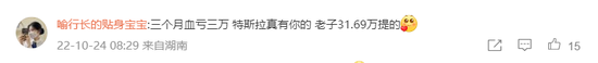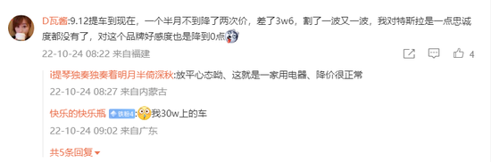 但有部分特斯拉车主却对此表示“很心塞”。有网友留言称:“无语,提车一周降八千,一个月一万四,牛啊你。”“三个月血亏三万 特斯拉真有你的。”更有车主表示:“9.12提车到现在,一个半月不到降了两次价,差了3w6,割了一波又一波,我对特斯拉是一点忠诚度都没有了,对这个品牌好感度也是降到0点。”