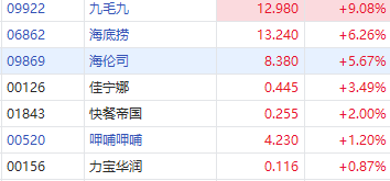 餐饮股今日大反攻,九毛九涨超9%涨幅靠前,海底捞涨超6%,海伦司涨超5%,呷哺呷哺涨超1%。