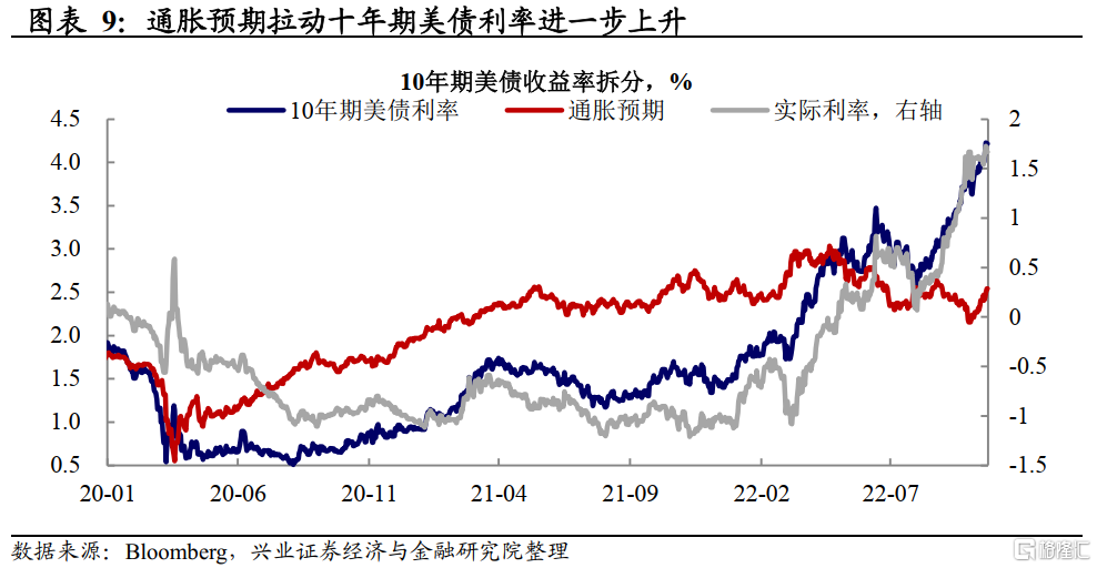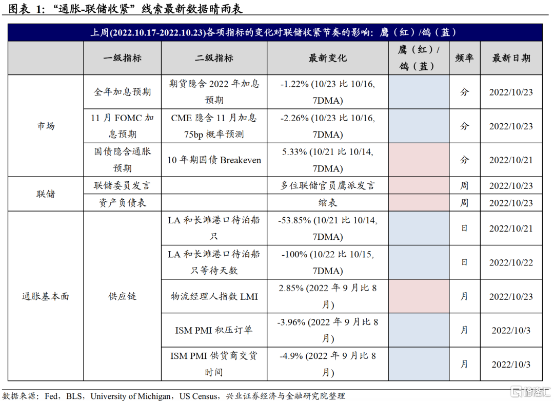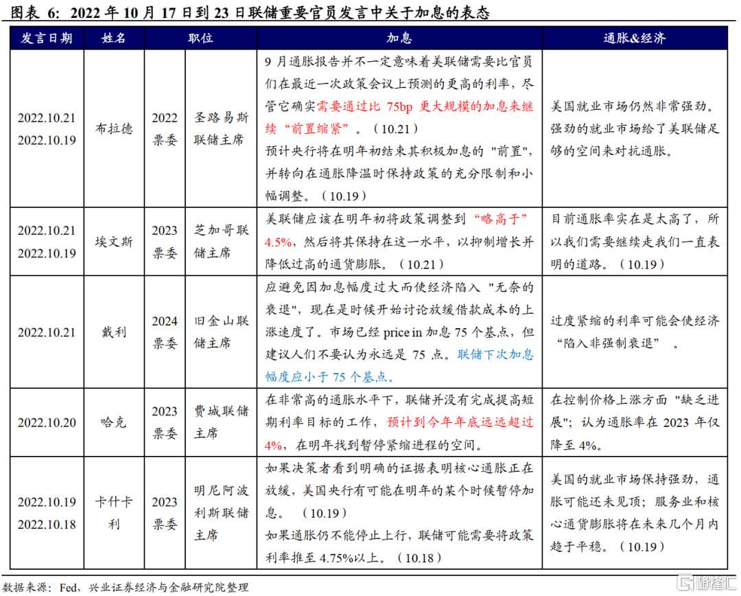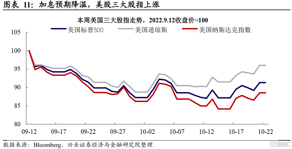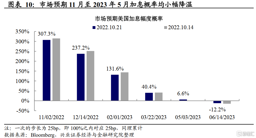 联储态度边际松动:或考虑12月放缓加息步伐。在6月加息会议上放风指引了75bp加息的华尔街日报记者Nick Timiraos在10月21日再次发文称联储或将暗示12月放缓加息步伐。(whether and how to signal plans to approve a smaller increase in December)。此后联储官员陆续放风释放鸽派信号:旧金山联储主席戴利称过度紧缩的利率可能会“使经济陷入非强制衰退”,并建议联储下次加息小于75个基点,圣路易斯联储主席布拉德表示“9月通胀报告并不一定意味着美联储需要比官员们在最近一次政策会议上预测的更高的利率”