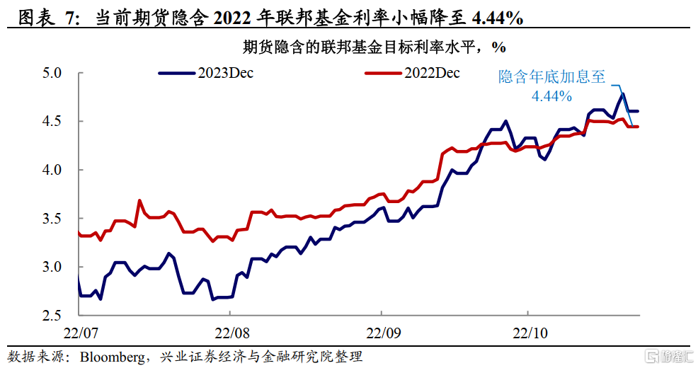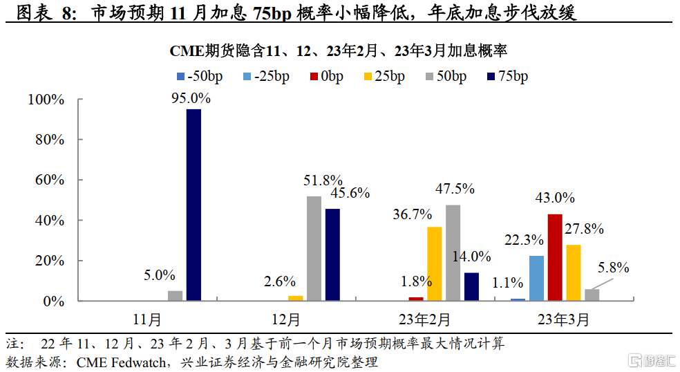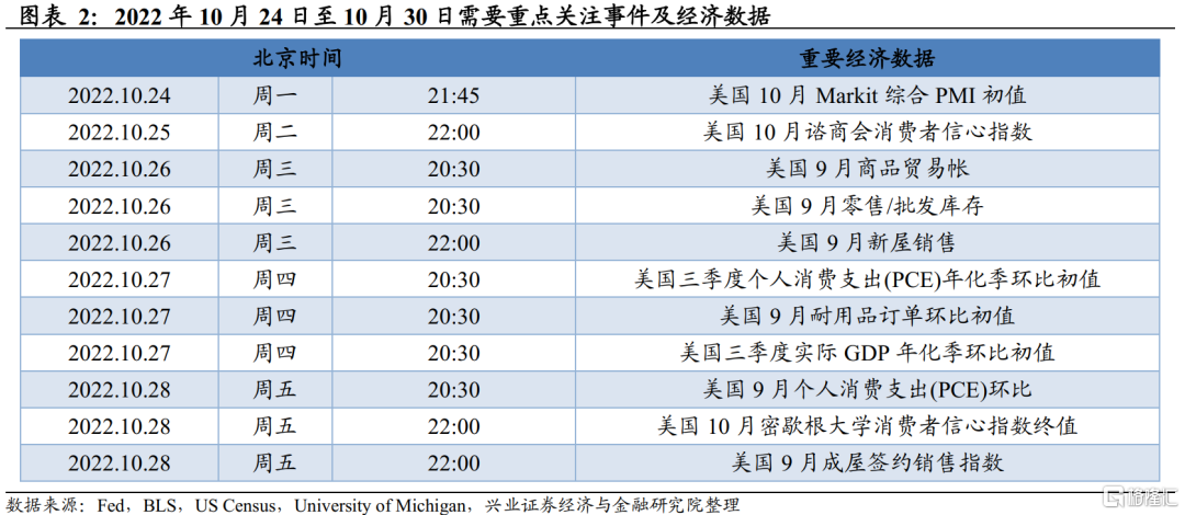 接近11月开会“靴子落地”,市场或阶段性松一口气。目前市场预期2022年11月、12月及2023年2月分别加息75bp、50bp、50bp,本轮加息终点至4.75%-5%。此后维持高利率至2023年12月再降息。本周美债一度10Y站上4.35%,2Y高点4.65%,3M高点4.1%,对联储当前的指引计入已经较为充分。在联储态度边际转折之际,市场或迎来阶段性反转。