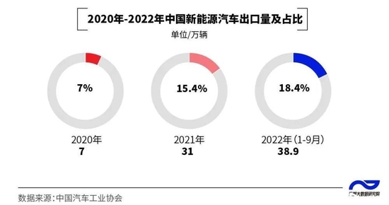 中国新能源车出口增长快速,且出口总量占比日渐扩大,2022年1-9月已达18.4%,同比增长翻番。
