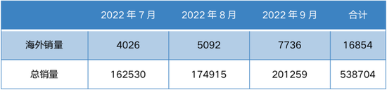 事实上,2022年7月起,比亚迪才在每月的产销快报上披露海外销量的数据。2022年第三季度,比亚迪的新能源车海外销量共计16854辆,仅占同期总销量的3.2%,比2021年全年占比微微提升,不过这三个月的增长很是可观,8月同比增速26.5%,9月同比增速进一步升至51.9%。