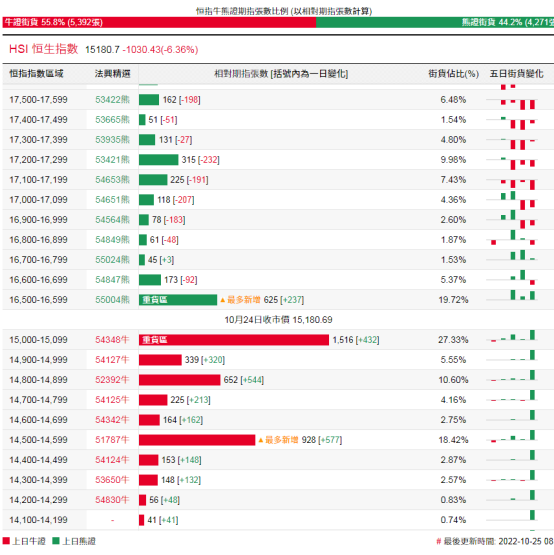 街货分布,至周一,恒指牛证街货在收回价14500点至15100点之间,累计相当约3824张期指合约;恒指熊证街货在收回价16500点至17300点之间,累计相当约1640张期指合约。