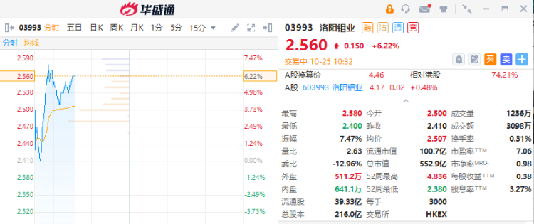10月25日讯,洛阳钼业(03993.HK)早盘涨超6%。根据公告,独立董事王友贵先生计划增持公司H股,本次增持股份数将不超过6000万股H股股份。