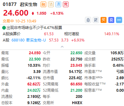 华盛资讯10月25日消息,君实生物盘中涨幅扩大逾8%,截至发稿,涨8.13%,报24.6港元,暂成交2525万港元。