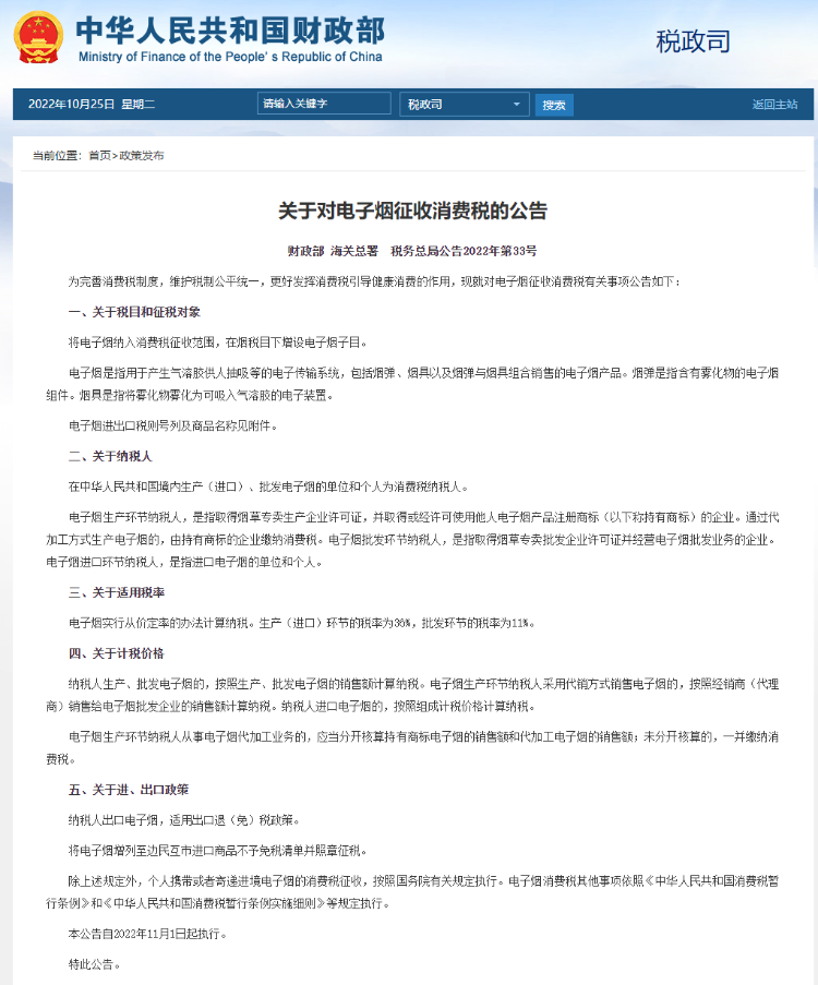 电子烟实行从价定率的办法计算纳税。生产(进口)环节的税率为36%,批发环节的税率为11%。该公告自2022年11月1日起执行。