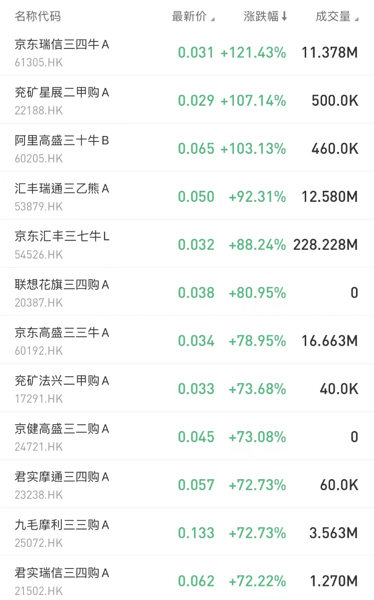 在今日涨幅榜中,京东瑞信三四牛A $61305.HK 涨121.43%,兖矿星展二甲购A $22188.HK 涨107.14%,此外,阿里高盛三十牛B $60205.HK 涨103.13%,汇丰瑞通三乙熊A $53879.HK 涨92.31%。