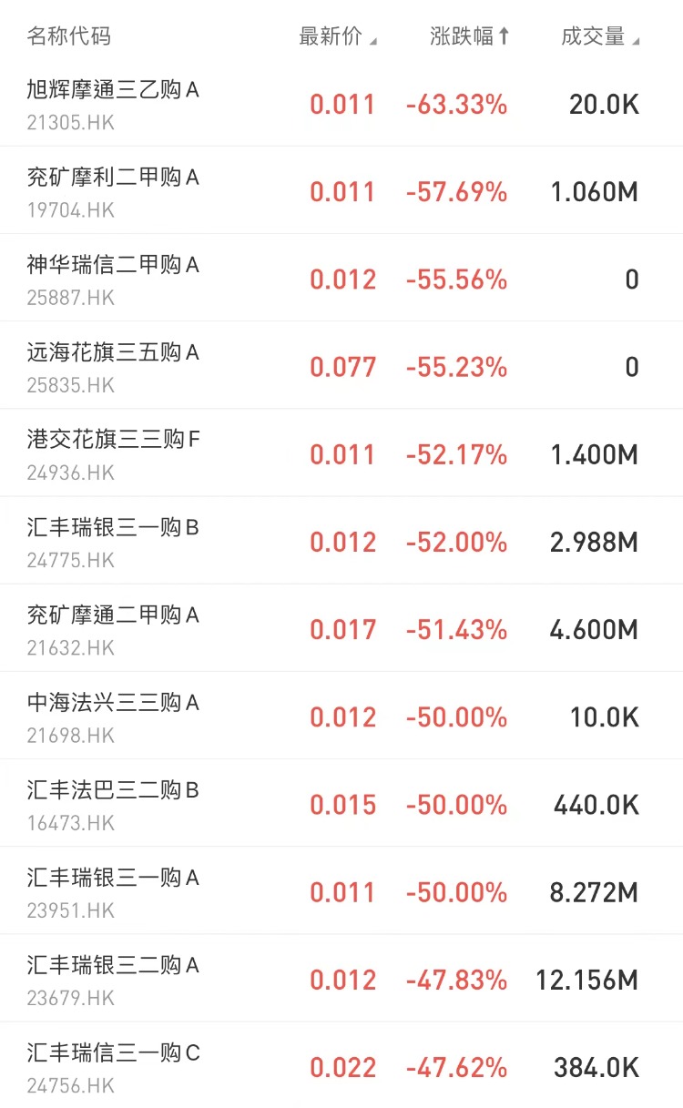 在今日跌幅榜中,旭辉摩通三乙购A $21305.HK 跌63.33%,兖矿摩利二甲购A $19704.HK 跌57.69%。